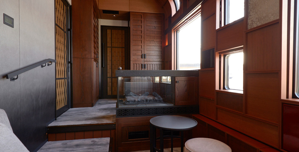 Il futuristico Shiki-Shima, il treno suite color oro, gestito dalla East Japan Railway, studiato per attraversare il nord-est del Giappone. Il treno è una vetrina per il design e l'artigianato giapponese. Dotato di una serie di suite a due piani con bagno, un osservatorio per ammirare il panorama e un raffinato ristorante.
